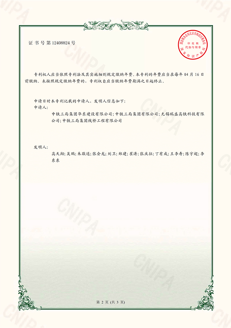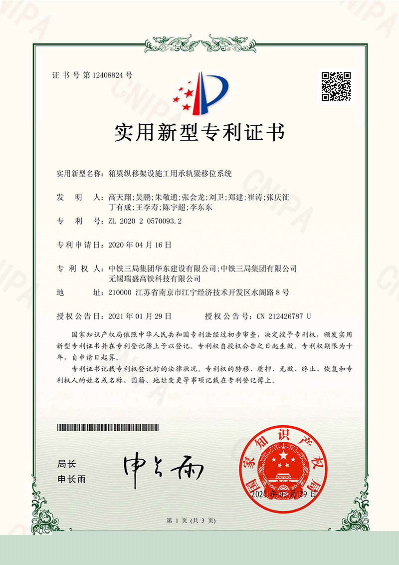 【實用新型專利證書】箱梁縱移架設施工用承軌梁移位系統