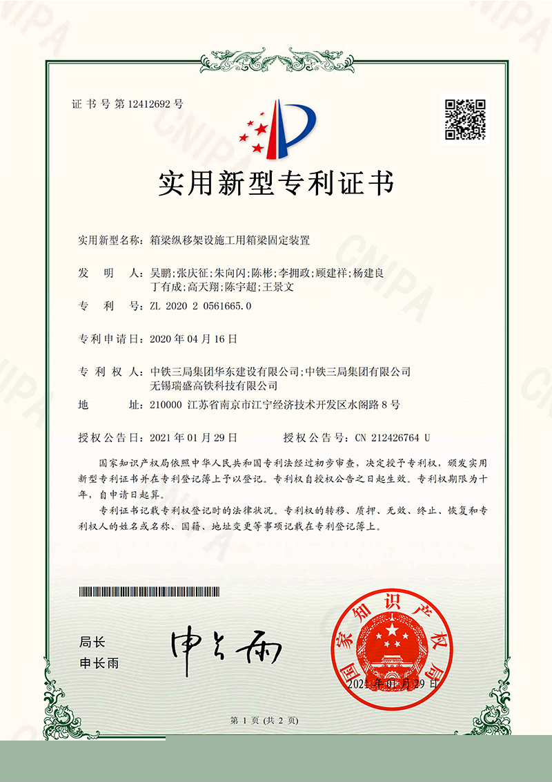 【實用新型專利證書】箱梁縱移架設(shè)施工用箱梁固定裝置