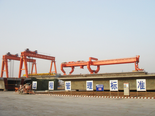 4、環(huán)境溫度的影響也是主要的因素之一,架橋機施工組拼時要按設(shè)計要求控制預(yù)拱度。架橋機縱向運行軌道兩側(cè)軌頂高度要求對應(yīng)水平,保持平衡。前、中、后支腿各橫向運行軌道要求水平,并嚴格控制間距,四條軌道需平行。